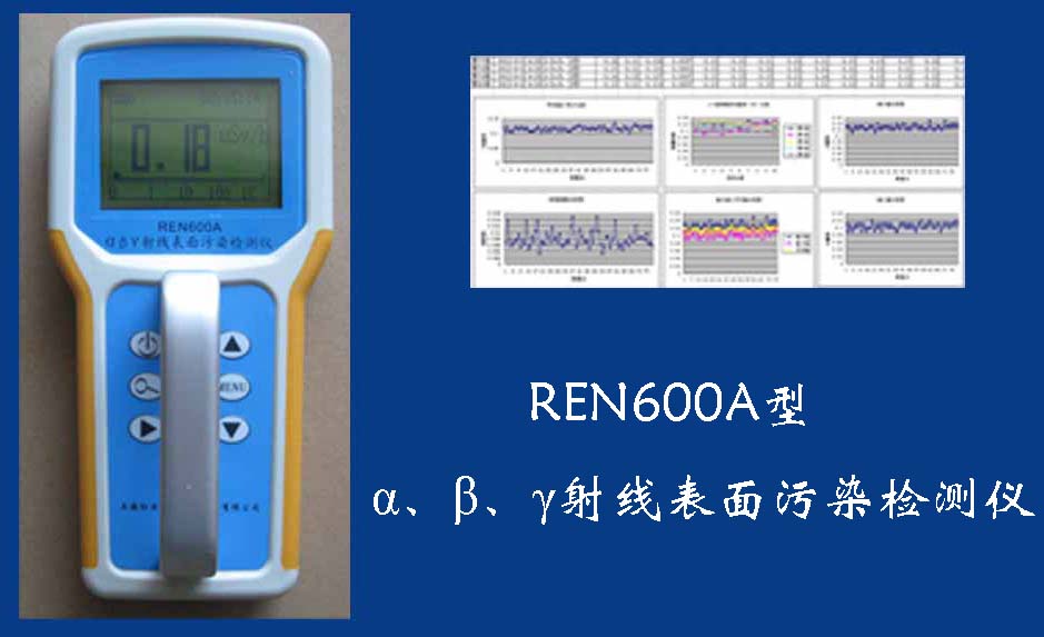 REN400型多功能輻射檢測儀是以內置高靈敏度蓋格計數管為探測器,外接不同類型的探頭來實現對低劑量χ、γ射線,高劑量χ、γ射線,α、β射線和中子射線的檢測。作為多功能輻射巡測儀,能顯示工作場所的輻射值,自動連續測量和記錄280萬條輻射劑量率數據,更換電池時,日歷、時間及檢測數據能永久保存。工作人員可以任意設定報警值,超閾值后自動發出聲音、震動和光報警。多功能輻射檢測儀適用于核設施、核技術應用單位、廢舊鋼鐵、防化部隊、 加速器、同位素應用、工業X、γ無損探傷、放射醫療、鈷源治療、γ輻照、放射性實驗室的輻射場調查及事故應急輻射測量& REN600A型α、β、γ射線表面污染檢測儀即可檢測α、β、γ射線,也能檢測到X射線,它采用高速嵌入式微處器作為數據處理單元,點陣式大屏幕LCD液晶顯示,讀數清晰、操作方便,具有400條超大容量數據存儲。儀器采用進口的大面積MICA蓋革探測器,具有較高探測效率,可進行α、β輻射表面污染檢測和X、γ輻射劑量率的監測。此外通過配套的RenriCont表面污染管理軟件可將存儲的數據讀出后分析。可廣泛用在制藥廠、實驗室、發電廠、進出口商檢、采石場、環境實驗室、環境污染調查、核安全應急、緊急狀況營救站、金屬處理廠、地下油田、供油管道裝備、醫院核醫學科、同位素實驗室、環境保護和警察局等部門。REN600A型α、β、γ射線表面